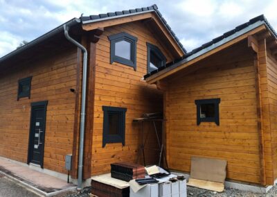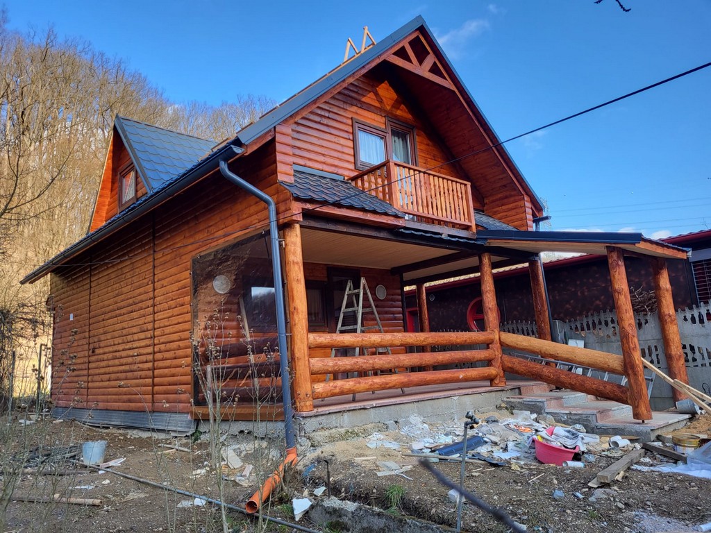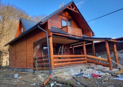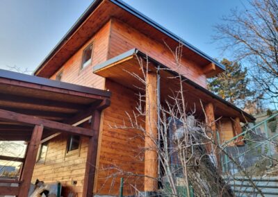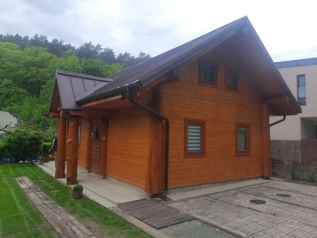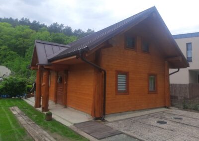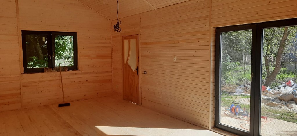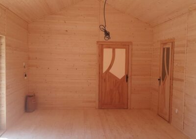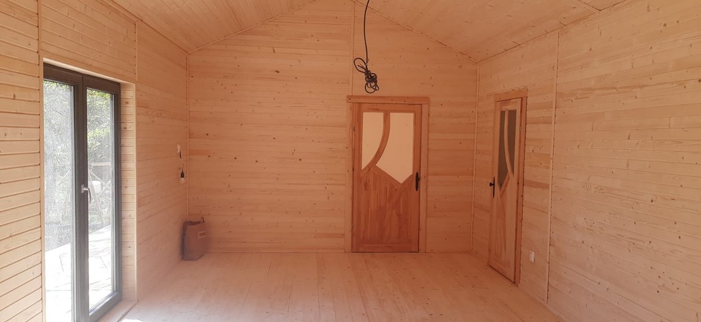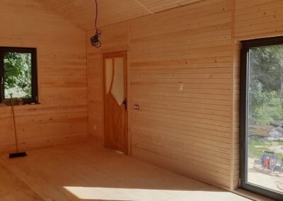 Szélezett gerendából, kívül-belül lambéria burkolás, közötte szigetelés.