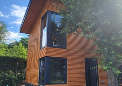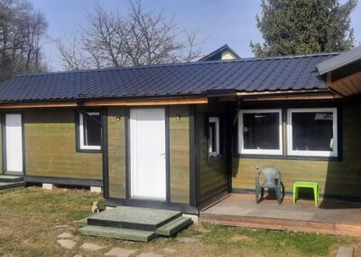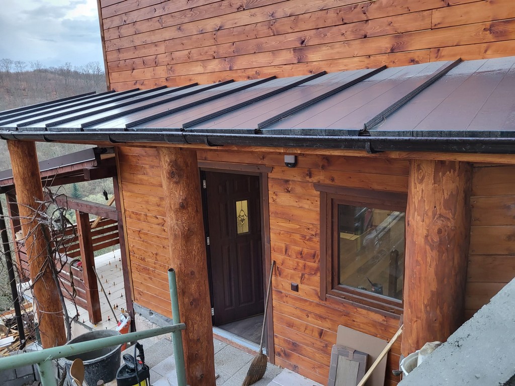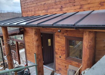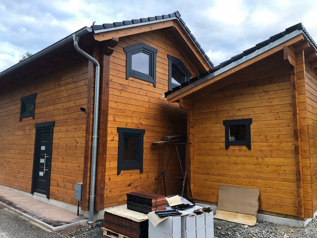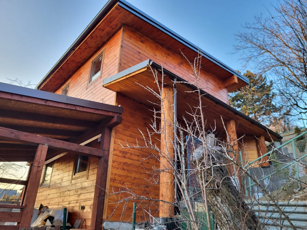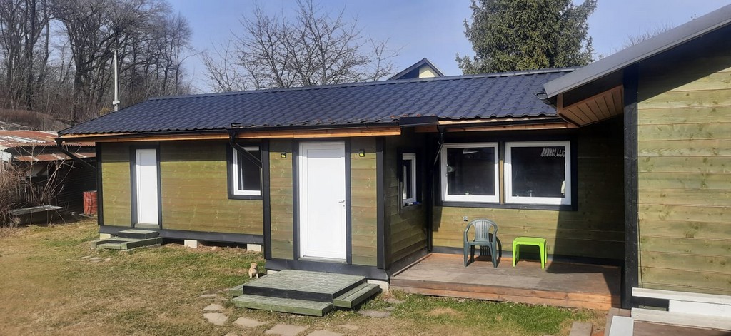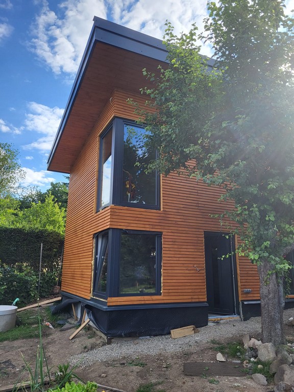 Szélezett gerendából, kívül-belül lambéria burkolás, közötte szigetelés.